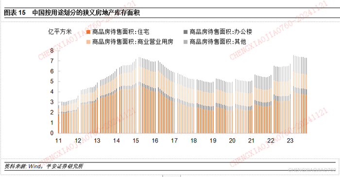 需要指出的是,本文的分析聚焦于住宅地产,前述除房地产开发资金来源、土地购置费等数据无法获取住宅分项外,其余各项指标均是对住宅口径的观测和分析。但当前中国非住宅地产的库存问题或更为严峻,截至2024年10月,商品房待售面积(即已竣工未售出的狭义房地产库存)共约7.3亿平,其中住宅库存3.8亿平,仅为总库存的一半;还有商业营业用房库存1.4亿平、办公楼库存0.5亿平、其他库存1.6亿平。