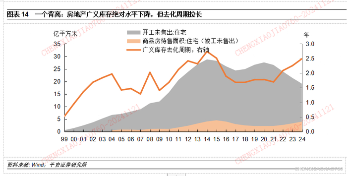 采用1999年以来累计的住宅新开工面积和住宅销售面积计算“开工未售出”的住宅库存,其两次峰值分别在2014年和2020年达到28.8万亿平方米和27.6万亿平方米,对应去化周期分别约为2年9个月和1年10个月。2015年中央经济工作会议提出“三去一降一补”,房地产去库存拉开帷幕。但2022年以来库存变化形势不同于以往,表现为绝对库存规模的减少和库存去化周期的拉长,也就是房地产销售更大幅度的缩减带来去库存压力。前9个月形势预示的2024年广义库存去化周期在2年6个月。因此,本轮去库存须更多从销售端着手。