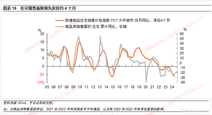 1)2005年以来,商品住宅销售面积增速大约领先70大中城市新房销售价格增速4个月。房地产止跌企稳最先反映在居民购房意愿提升上,然后房企和卖方才有提价能力。2024年6月以来,商品住宅销售面积同比跌幅收窄,有望带动10月以后房价同比跌幅收窄。事实上,今年10月70大中城市二手房价格同比跌幅已现收窄,新房价格同比跌幅尽管仍有小幅下降,但一线城市新房价格也已呈降幅收窄。
