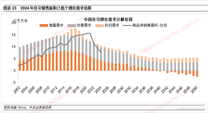 1、 增量需求。国家统计局数据显示,2000年至2023年,中国总人口年均增长0.48%,而城镇化率年均提升1.31个百分点,使城镇人口年均增速达到3.2%。新增城镇人口往往意味着增量的商品房需求,是房地产销售增长的重要支撑。我们使用二次函数拟合近年来新增城镇人口的数量,以拟合值代替实际值来平滑年度波动,将每年的城镇人口增量乘以城镇人口人均居住面积,测算得到城镇人口带来的增量需求。测算结果表明,新增城镇人口带来的商品房需求在2016年左右达到顶峰(约8.6亿平米),而后随着城镇化步伐放缓、总人口的减少,城镇人口增加带来的增量商品房需求到2023年约降至4.8亿平米左右。