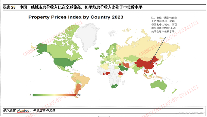 从国际比较来看,Numbeo数据库统计了全球主要城市的房价收入比情况,其中中国2023年的统计包括北上广深和杭州、成都、香港七大城市,其房价收入比达到29.43倍,与诸葛数据的测算相符。中国一线城市房价收入比在全球属于高水平,但百城平均房价收入比处于全球中位数水平。