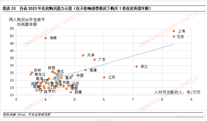 房价收入比的概念仍相对抽象,更直观地,我们对各省居民正常消费情况下购买一套住房所需年限做一估算。直观起见,我们计算2人家庭购买一套80平米住房平均所需年限=40平米*住宅平均销售价格/(人均可支配收入-人均消费支出)。从结果来看,中国不同地区的房价可承受力存在分化,北京、上海和海南处于一个高房价的极端,而绝大部分省份购房所需年限平均在10-30年之间,与个人住房贷款的可选期限近似。这同样说明,中国房价在整体意义上并非高不可攀,但居民购房意愿的释放需要有稳定的长期收入预期作为支撑。特别是,从时间序列来看,2002年以来一线城市房价一直“很贵”,但全国平均水平上,居民的住房购买能力是随着经济发展而趋于增强的。