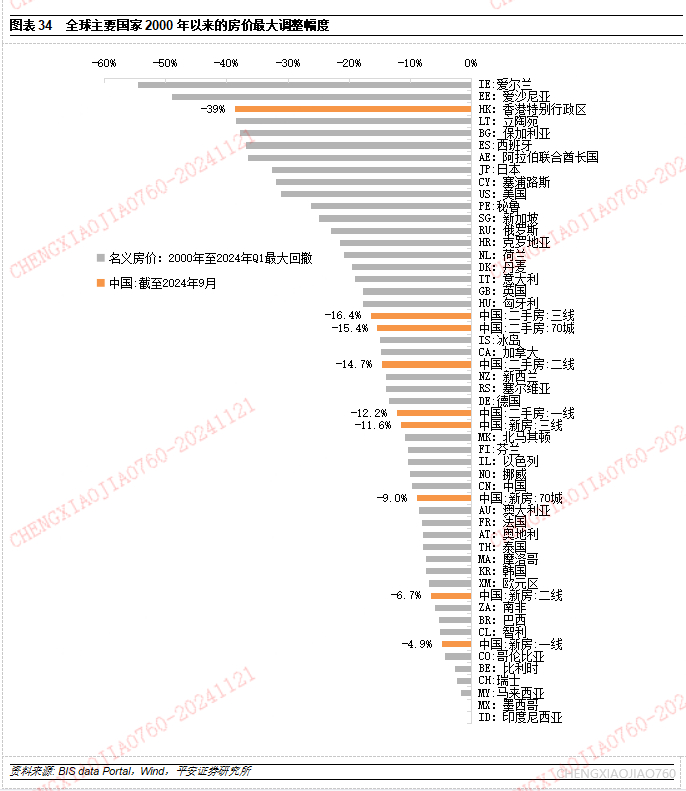 若能采取有效措施扭转预期,有利于促进居民重新“入场”,更好支撑房地产市场止跌回稳。从国际经验来看,我们基于BIS数据库计算了全球主要国家2000年以来的房价最大调整幅度。很多国家都曾出现大于20%、甚至50%的房价调整,中国香港的跌幅39%居于前列,中国大陆目前的平均降幅仍属温和。如我们前文阐释的,房地产潜在需求的释放往往是脉冲式的,如果不能采取有效措施扭转预期,则购房行为可能一再延后,房价及一系列指标也完全可能进一步下探。从前述我国销售与房价之间的领先滞后关系来看,2024年6月以来,我国商品住宅销售面积同比跌幅收窄,有望带动10月以后房价同比跌幅收窄,但在一段时间内可能仍处负增区间。根据国家统计局数据,10月70大中城市二手房价格同比跌幅收窄0.1个百分点至-8.9%,一线城市新房价格降幅也收窄0.1个百分点至-4.6%。