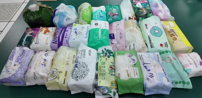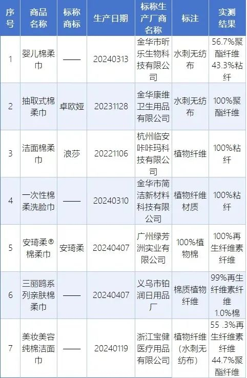 此次未标注纤维成分及含量的5批次产品,均标称主要材料为“水刺无纺布”。“水刺无纺布”是无纺布的一种加工工艺,非成分材质,具体工艺为将高压微细水流喷射到一层或多层纤维网上,使纤维相互缠结在一起,从而使纤网得以加固而具备一定强力,得到的织物即为水刺无纺布。本次检测的多款水刺无纺布的产品,成分多为聚酯纤维和粘胶纤维。