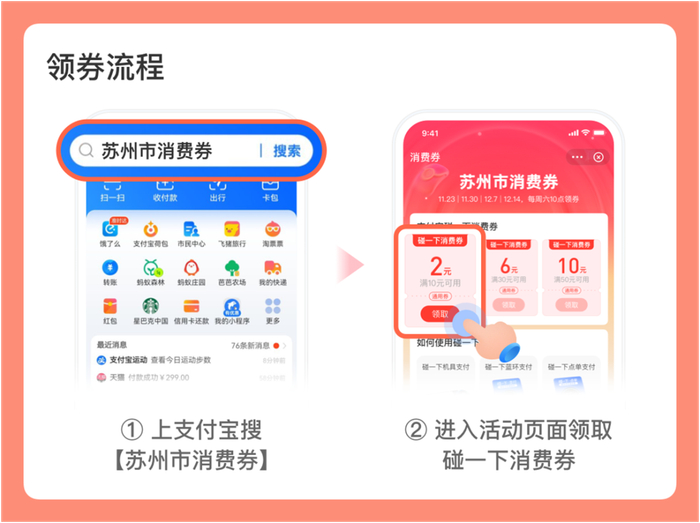 所有定位在苏州的人员(包括外地来苏人员),均可上支付宝App搜索【苏州市消费券】,进入活动页面领取。
