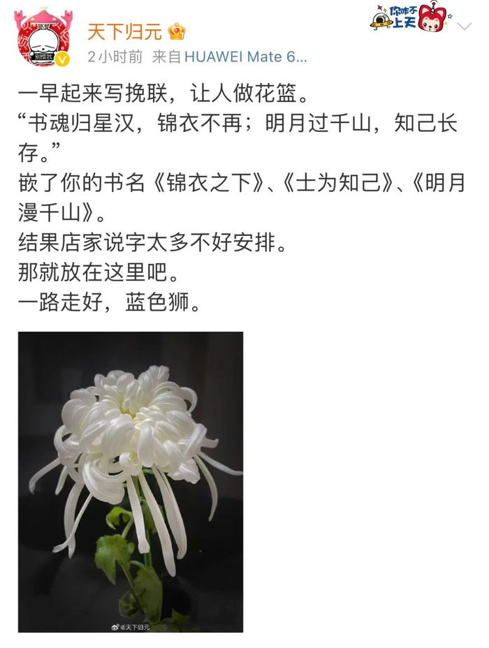 演员任嘉伦发文:“有幸与您笔下的陆绎走过人生重要的一程,愿安息。 ”
