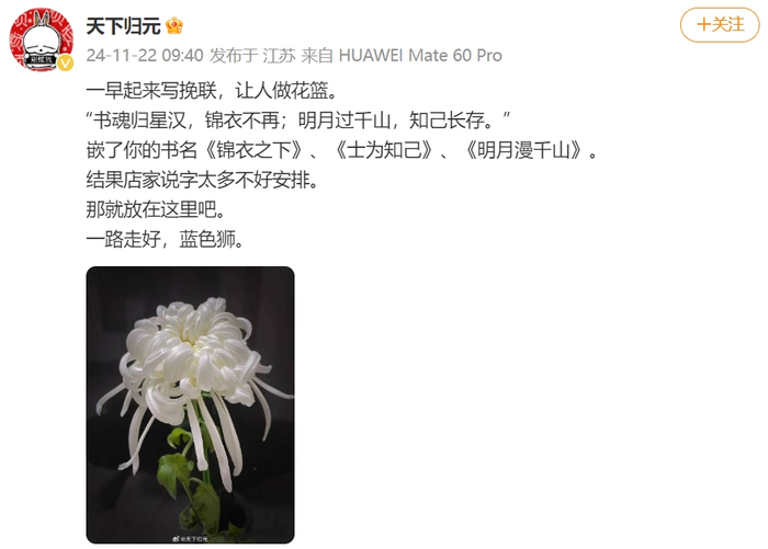 中国作家协会会员“天下归元”透露,自己的作家朋友蓝色狮因癌症去世。刚刚,她发博悼念道:一早起来写挽联,让人做花篮。“书魂归星汉,锦衣不再;明月过千山,知己长存。”嵌了你的书名《锦衣之下》《士为知己》《明月漫千山》。结果店家说字太多不好安排。那就放在这里吧。一路走好,蓝色狮。