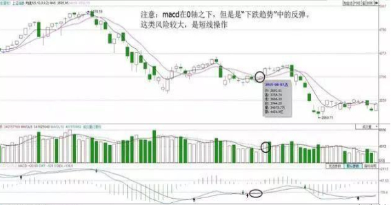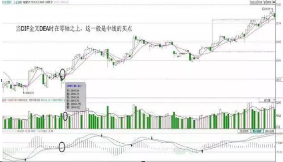 3、MACD的黄金交叉,不管是DIF、MACD是在0轴之上还是在0轴之下,当DIF金叉DEA时在零轴之下,通常是短线的买卖点,而且常常是空头暂时回补的反弹。当DIF金叉DEA时在零轴之上,通常是中长线的买卖点。Macd代表的“势”。