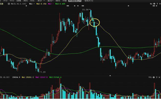 第四、在拉升的末期,股价击穿生命线,宣告波段行情结束,随后将是盘头阶段。