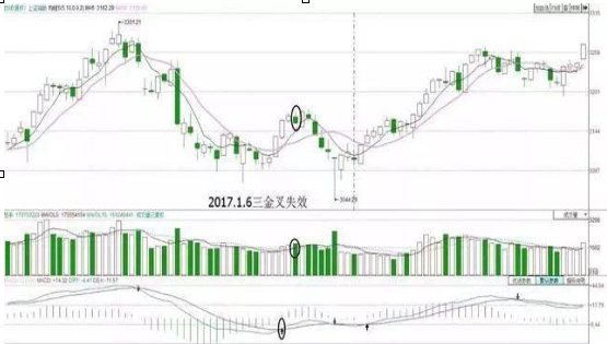 所谓的5日、10日均线、均量线以及MACD三金叉并非绝对要求同时或同一天金叉的,这仅是一种简单的描述。事实上均线、均量线及MACD三金叉只要在几个交易日之内发生,都可视同于“三金叉”。由于探底之前往往有一个放量的过程,均量线的金叉往往是第一个出现,三者当中最后一项发生金叉时就是短中线的买入信号。
