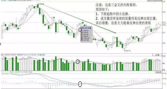 三金叉出现在潜收集之后的强收集时,是强势上攻的信号,比如在“W底”之后出现的三金叉,一旦放量通过“W底”的颈线就会加速上扬!