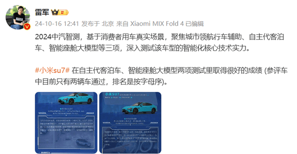 自动泊车又称智能泊车,驾驶员行驶车辆至车位附近后,开启自动泊车功能,车辆将识别目标车位并自动泊入。此前小米CEO雷军还在微博宣布,小米SU7在2024中汽智测自主代客泊车、智能座舱大模型两项测试里取得很好的成绩(参评车中目前只有两辆车通过,排名是按字母序)。