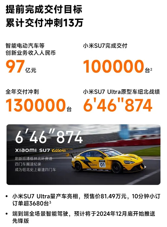 小米汽车等创新业务仍处于亏损状态,经调整净亏损为15亿元,但随着交付量的增加,亏损正在逐渐收窄。值得一提的是,小米汽车已于11月18日提前完成10万台新车交付目标。2024全年将冲刺13万台交付目标。