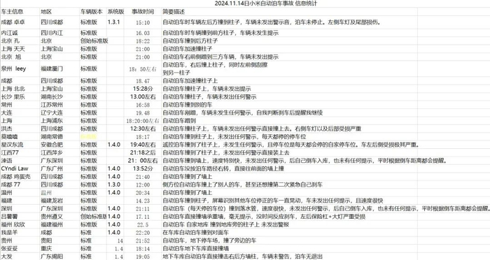 据“红星新闻”,截至11月20日,统计到70多位小米SU7标准版车主在11月14日中午至11月15日凌晨因自动泊车功能故障,导致车辆泊车过程中发生剐蹭和碰撞。被统计的车主来自北京、天津等多地,有些车主是在社交平台自曝的故障,为此还专门成立了“小米SU7标准版事故车主群”。
