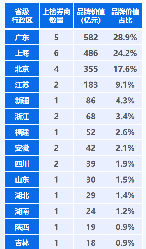 今年的品牌价值TOP30榜单中,在国内34个省级区域中,只有14个区域有券商上榜。