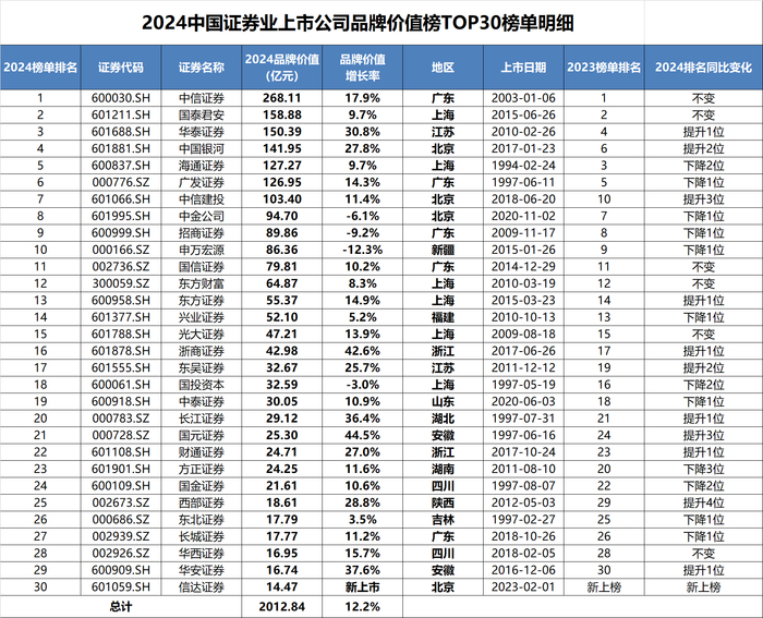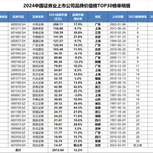 “2024中国证券业上市公司品牌价值榜”发布:TOP30券商品牌价值首次突破2000亿,多家券商品牌价值6年间增长超100%