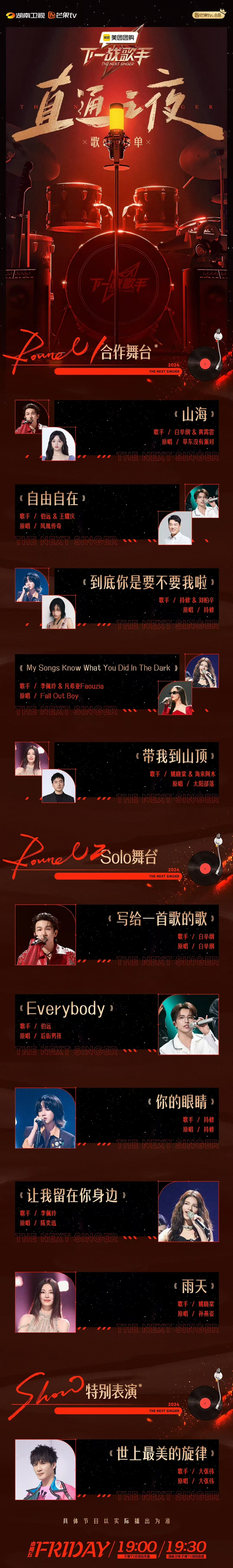 在此前的节目中,白举纲对不少歌曲融入了自己的独特改编,给观众带来了耳目一新的全新感受。今晚他将用一首《写给一首歌的歌》,唱出自己对生活的独特感悟。在节目中带来了《MAMA》《Counting Stars》等唱跳节目的伯远,这次则将挑战后街男孩的《Everybody》,带领大家一同重温经典。持修将首唱新歌《你的眼睛》,诠释先爱自己才会有人爱你的主旨。
