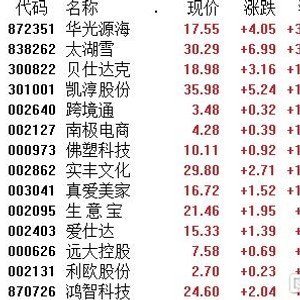 截止发稿,华光源海、太湖雪30CM涨停,贝仕达克、凯淳股份涨超17%,跨境通、南极电商、佛塑科技、实丰文化等涨停。