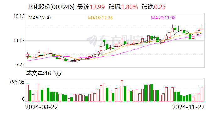 2024年前三季度,北化股份实现收入13.01亿元,归母净利润-4654万元。