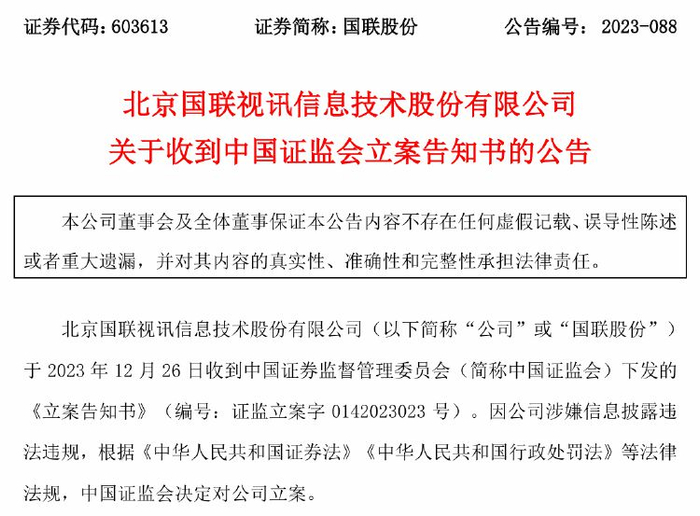 据悉,2023年12月26日,国联股份收到证监会下发的《立案告知书》,因公司涉嫌信息披露违法违规,证监会决定对公司立案。