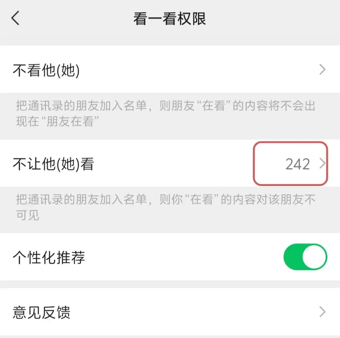 第三步:当你添加完所有好友后,在「不让他(她)看」就可以看到你的有效好友总数,换句话说就是这些人都没有删你,比如下图是242个人是有效好友,都可以发消息。