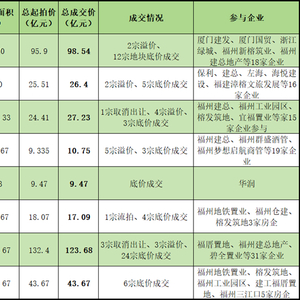 其中,福州三江口建设发展有限责任公司以19.88亿竞得仓山区三江口片区136.82亩地块;福州地铁置业有限公司6.64亿元将仓山区原建新花卉市场地块收入囊中;福州工业园区开发集团有限公司以3.58亿斩获仓山区福峡路近40亩地块;福州建工福厝置地有限责任公司2.46亿摘得仓山福峡路E-09号26.62亩宅地;