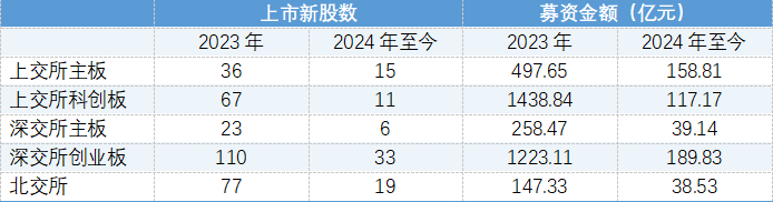 截至2024年11月18日,中国股市在2024年的新股上市情况表明,与2023年相比,整体上市新股数量和募资金额均出现了显著下降。2024年,中国股市共上市了84只新股,实际通过首次公开募股(IPO)筹集的资金总额为543.48亿元人民币,远低于2023年的3565.39亿元人民币。在2024年上半年,A股市场仅有44只新股上市,募资总额约为324.93亿元人民币,较2023年同期的173只新股和2096.77亿元的募资额相比,大幅减少。综上所述,2024年无论是上市新股的数量还是募资金额,均呈现出大幅减少的趋势。