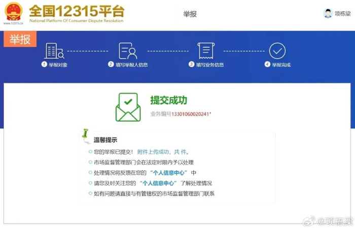 @项栋梁 在博文中贴出了钟晱晱相关言论截图,以及自己举报成功的截图。