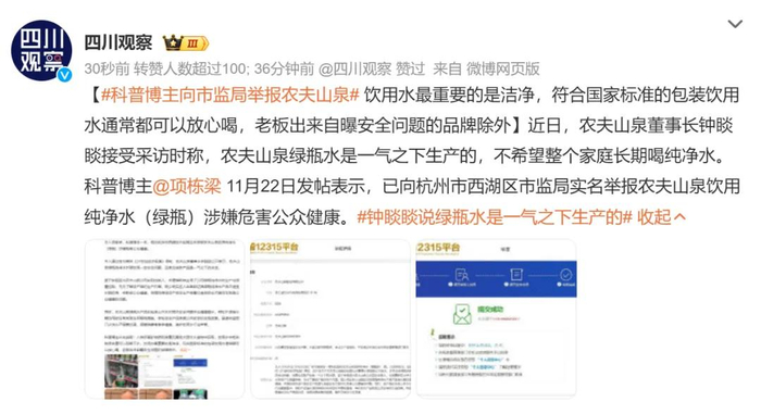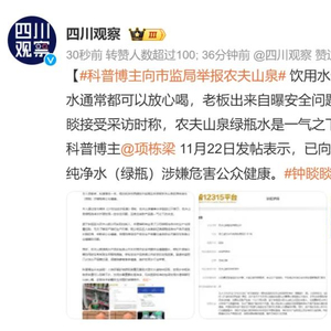 科普博主@项栋梁 11月22日发帖表示,已向杭州市西湖区市监局实名举报农夫山泉饮用纯净水(绿瓶)涉嫌危害公众健康。