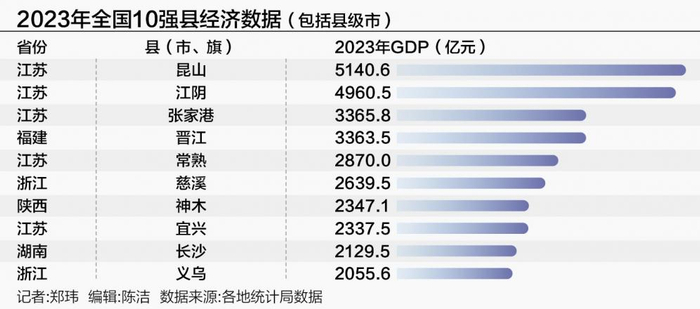 除长三角外,福建、陕西、湖南3省份也有千亿县闯入全国十强,分别是排名第4的福建晋江、第7的陕西神木以及第9的湖南长沙。