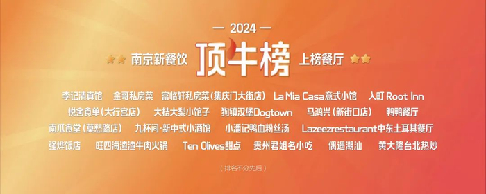 ○ 这份榜单里,有大家耳熟能详的锅贴名店李记清真馆,有游客争相打卡的小潘记鸭血粉丝汤,有极具南京特色的餐馆金哥私房菜、富临轩私房菜,还有新中式菜馆和西餐厅以及中东菜等,真是太丰富啦~