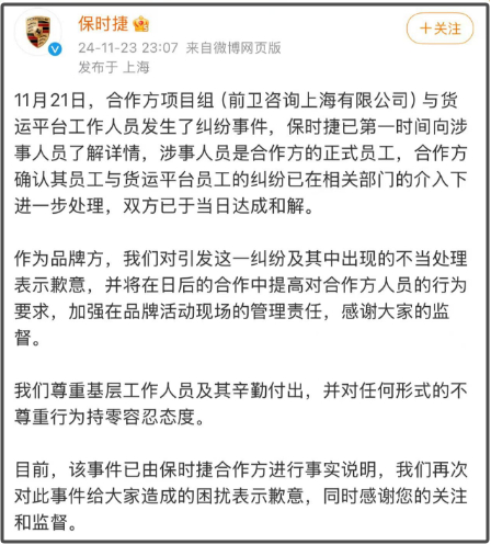 保时捷在声明中称:11月21日,合作方项目组(前卫咨询上海有限公司)与货运平台工作人员发生了纠纷事件,保时捷已第一时间向涉事人员了解详情,涉事人员是合作方的正式员工,合作方确认其员工与货运平台员工的纠纷已在相关部门的介入下进一步处理,双方已于当日达成和解。保时捷称,作为品牌方,该司对引发这一纠纷及其中出现的不当处理表示歉意,并将在日后的合作中提高对合作方人员的行为要求,加强在品牌活动现场的管理责任,感谢大家的监督。