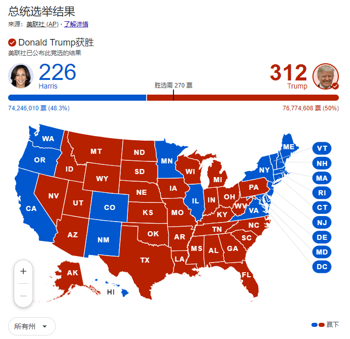 2024年美国总统大选,特朗普以大幅领先的优势重回白宫。
