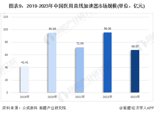 据众成数科数据分析,2019年我国医用直线加速器市场规模达到42.41亿元,2020年增长较快,达到95.69亿元,2020年至2023年三年间,受疫情及核技术发展影响,市场规模略有浮动,2023年达到68.07亿元,但根据技术发展趋势及国家政策扶持影响而判断,我国医用直线加速器市场规模整体呈波动增长趋势。