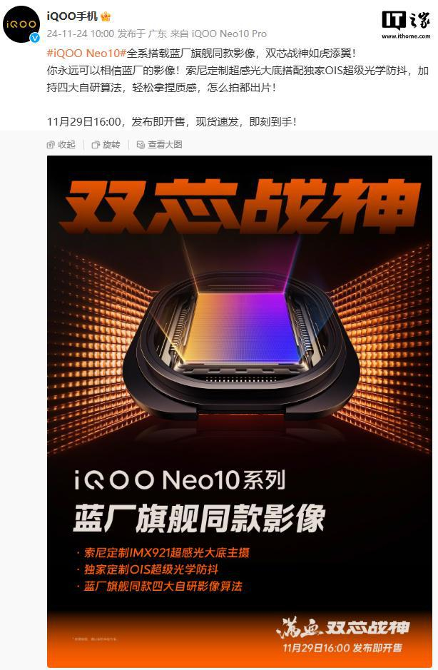 iQOO Neo10 全系搭载蓝厂旗舰同款影像,索尼定制 IMX921 主摄