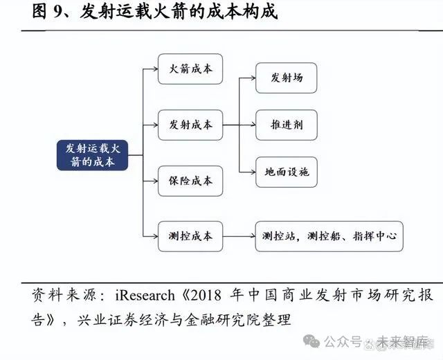 运载火箭的成本主要包括火箭成本、发射成本、测控成本以及保险产生费用等, 据 iResearch《2018 年中国商业发射市场研究报告》,SpaceX 猎鹰 9 号运载火箭 发射成本中,火箭成本占比最高,约为 53%;发射和测控成本主要受火箭规模和 品种的影响;保险费用主要取决于火箭发射成功率。因此,在运载火箭发射的成 本构成中,火箭成本是最重要的可控成本。
