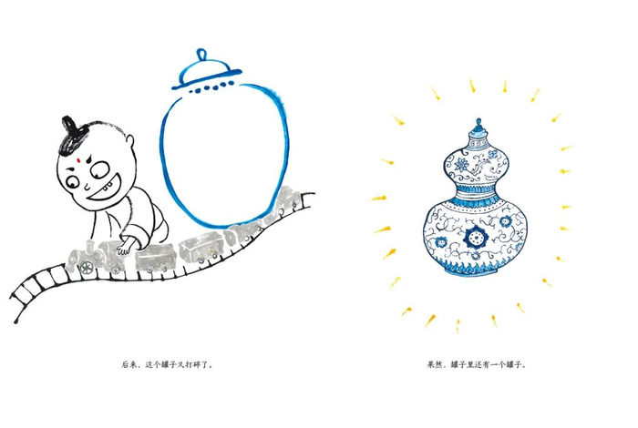 一天,小男孩收到一个礼物,是一个漂亮的青花瓷罐。可他一个不小心,瓷罐打碎了!好在——瓷罐里面还有一个瓷罐!可不久,这个瓷罐又打破了,瓷罐里还有一个更小的瓷罐……瓷罐继续被“不小心”打破,直到露出一座小亭子。这一次,小男孩迫不及待地打破它,结果什么都没有了!但他有了一个秘密,一个打破瓷罐不敢与外人说的秘密。为了让这个秘密永远封存,他重新把它装进一层一层的瓷罐,作为礼物送给了自己的朋友……