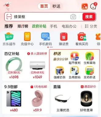 打开京东App,发现首页多了一个入口,叫“秒送”。下面写着:“最快9分钟”。