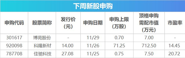 Wind数据显示,下周将有3只新股发行。具体来看,11月25日发行的是佳驰科技;11月26日发行的是科隆新材;11月29日发行的是博苑股份。
