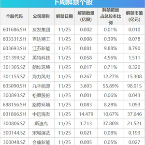 Wind数据统计显示,下周(11月25日-11月29日)共有57家公司限售股陆续解禁。