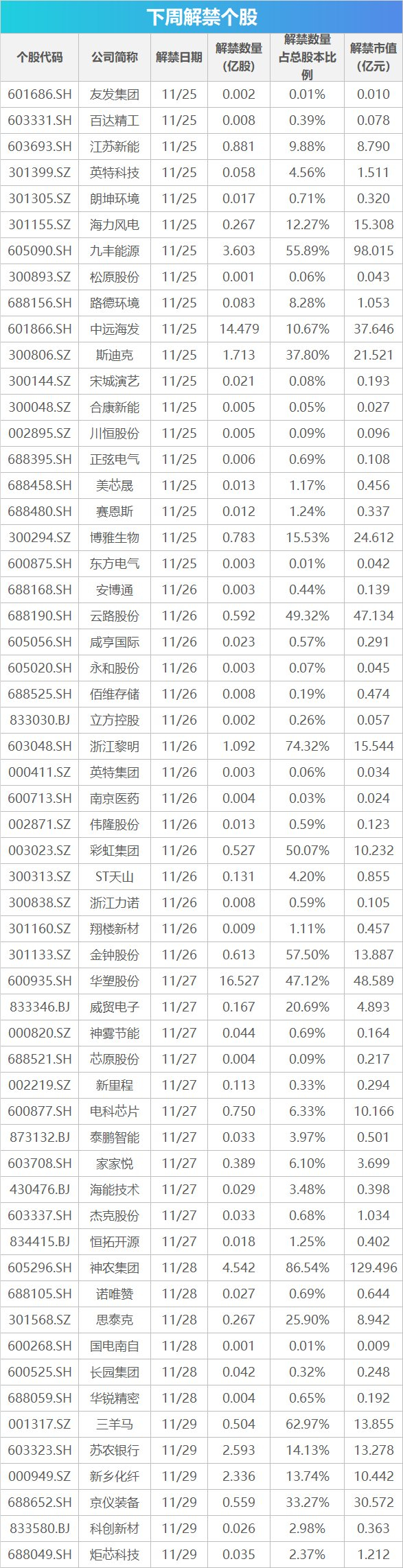 按11月22日收盘价计算,解禁市值居前三位的是:神农集团(129.5亿元)、九丰能源(98.01亿元)、华塑股份(48.59亿元)。从个股的解禁量看,解禁股数居前三位的是:华塑股份(16.53亿股)、中远海发(14.48亿股)、神农集团(4.54亿股)。