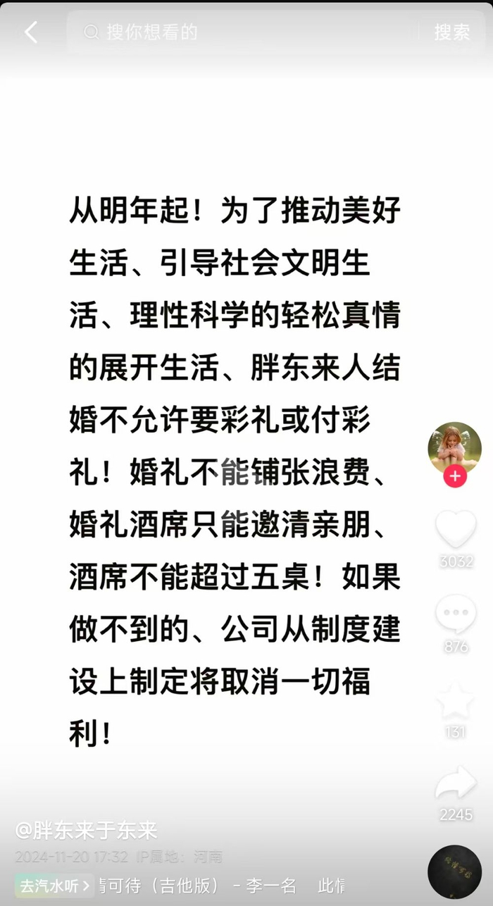 • “从明年起,胖东来人结婚不允许要彩礼或付彩礼!婚礼不可铺张浪费,宴请仅限亲朋好友,桌数不得超过五桌!若无法遵守,公司将取消所有福利!”
