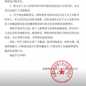 声明称:近日,成都啊呀啦嗦文化传播有限公司发现一位自称王金兰的女士,通过各短视频平台使用相关账号发布虚假信息,其发布的视频中捏造虚假事实,谎称“刀郎(罗林)与某人进行权钱交易”,并诬陷刀郎“剽窃她二十首原创作品”。
