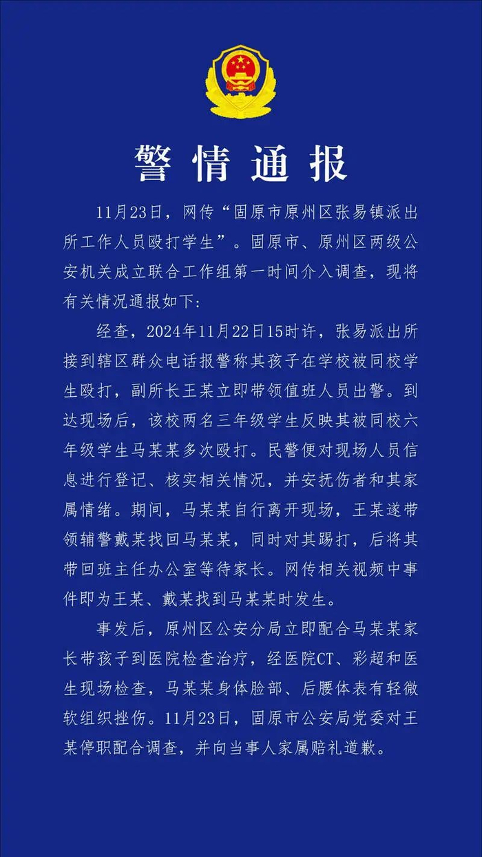 宁夏回族自治区固原市公安局原州区分局11月24日通报称,事发后,固原市、原州区两级公安机关成立了联合工作组,经介入调查:视频中,被打者系原州区张易镇学生马某某,打人者是时任张易派出所副所长的王某,视频中另一人是张易派出所值班人员戴某。针对民警执法中存在的问题,经固原市公安局党委研究决定,给予王某撤销行政职务处分。