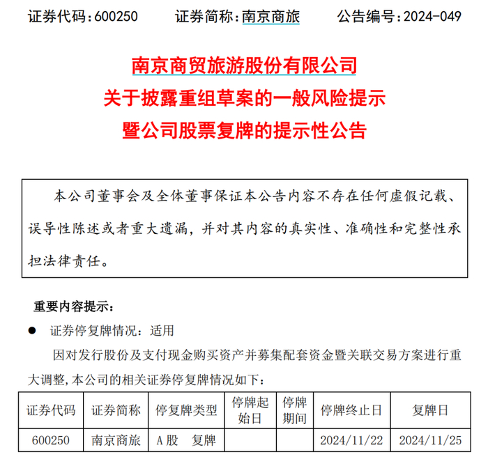 南京商旅11月24日公告,公司拟以发行股份及支付现金的方式,购买南京旅游集团持有的南京黄埔大酒店有限公司100%股权,同时拟向不超过35名符合条件的特定投资者发行股份募集配套资金。公司股票将于2024年11月25日开市起复牌。