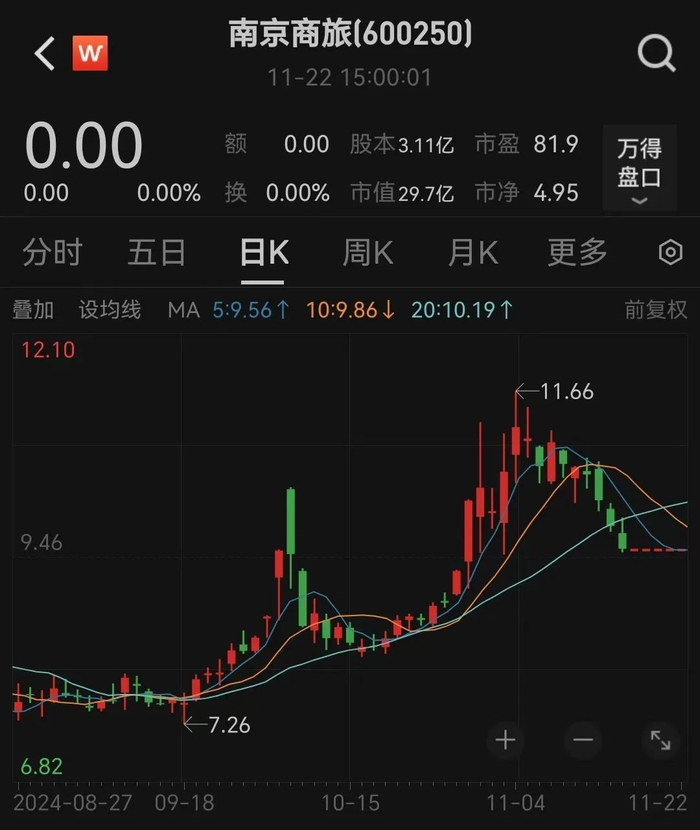 停牌前的11月15日,南京商旅股价报9.56元,市值为29.7亿元。