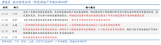 >五、多部门跟进发布多项稳地产举措,包括11.13财政部等房地产税收新政,下调契税、增值税、土地增值税预征率下限;11.12自然资源部发布《关于运用地方政府专项债券资金收回收购存量闲置土地的通知》;此外,一线城市均取消普宅和非普标准,广州将房票安置范围扩大至全市。