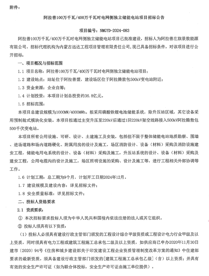 远景能源阿拉善1GW/4GWh独立储能电站招标