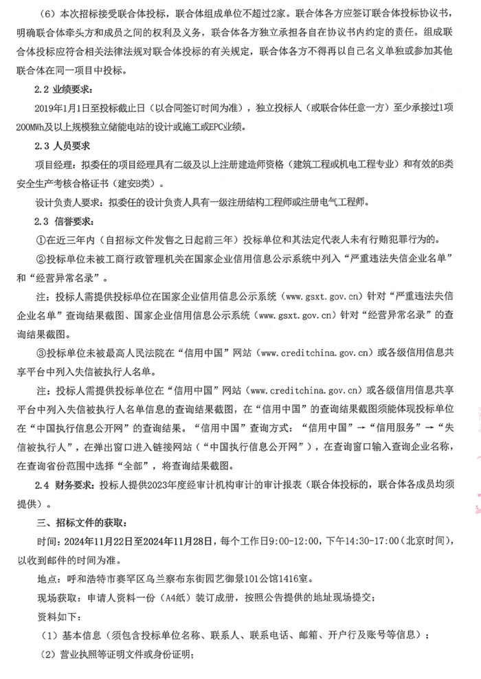 接受联合体投标,联合体单位数不超过2家。2019年1月1日至投标截止日(以合同签订时间为准),独立投标人(或联合体任意一方)至少承接过1项200MWh及以上规模独立储能电站的设计或施工或EPC业绩。