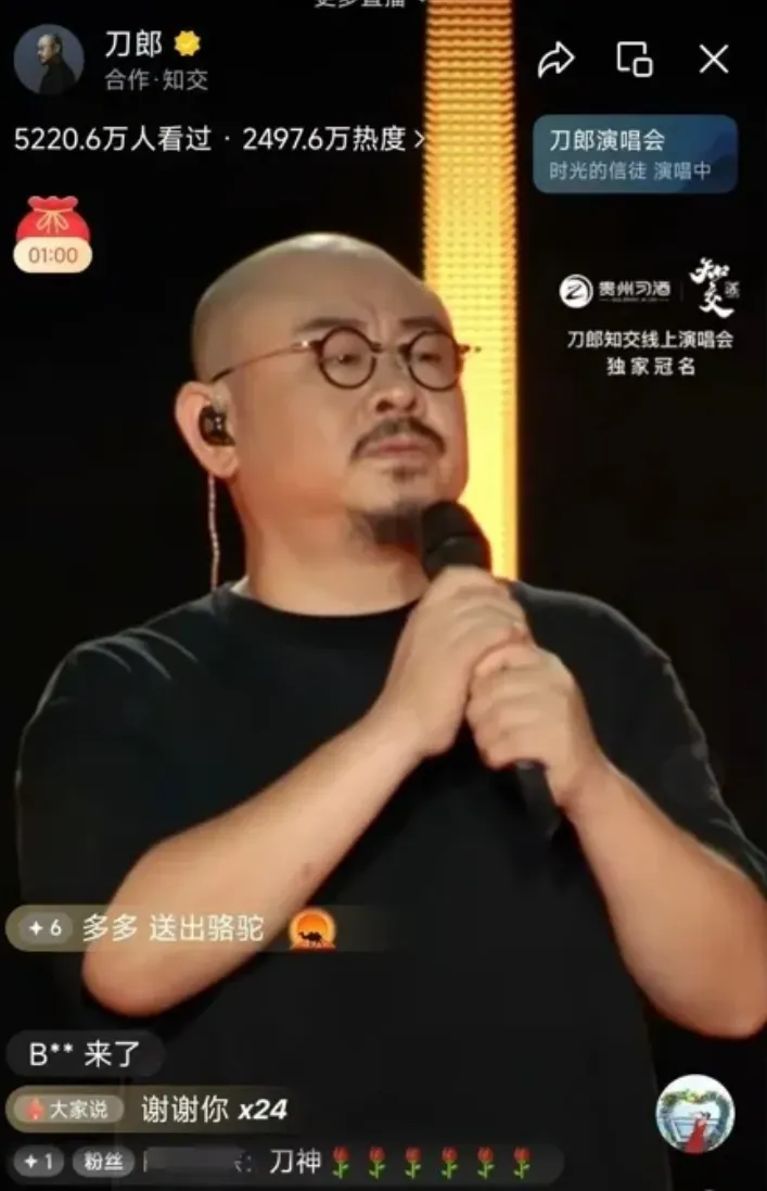 有酒企借助刀郎的流量密码借势出圈。贵州习酒旗下的知交酒作为刀郎线上演唱会的独家冠名商,在演唱会进行期间,运用“赠送礼物”(打赏)的互动形式,实现了品牌的高频曝光。